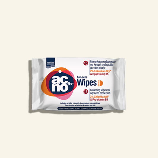 Acnofix Wipes with 2% Salicylic Acid* & Pro-vitamin B5 are soft cleansing wipes with keratolytic action that clean thoroughly the skin. Acnofix wipes remove effectively dead cells and pollutants, leaving the skin smooth and clean, while they prevent clogging of pores. Enriched with pro-vitamin B5, which nourishes the skin and contributes to its good health, and menthol that refreshes and soothes acne skin.