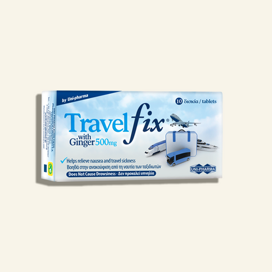 Helps relieve nausea and travel sickness.The food supplement Travel Fix contains Ginger herbal extract (500 mg Ginger per tablet) and helps relieve nausea and motion sickness during traveling.