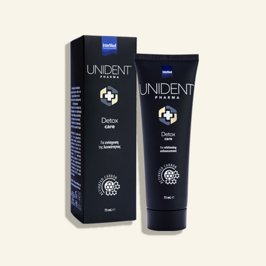 Unident Pharma Detox Care is a whitening toothpaste specially designed for everyday use, as it contains safe bleaching agents that restore and maintain the natural white tooth color giving a wonderful smile. It effectively and safely removes surface dyschromias and at the same time strengthens the enamel as it provides fluoride and the necessary structural hydroxyapatite.